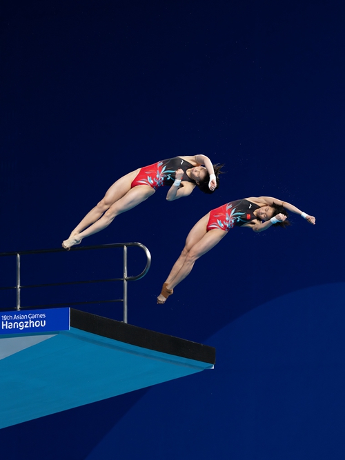 9月30日,杭州亚运会女子双人10米跳台决赛,中国组合全红婵/陈芋汐夺冠,拿下跳水首金。视觉中国供图