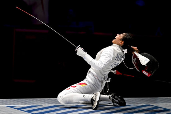 9月25日,杭州亚运会女子个人花剑决赛,中国选手黄芊芊夺冠后呐喊庆祝。视觉中国供图