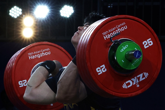 10月6日,杭州亚运会举重男子109公斤级赛,中国选手刘焕华获得金牌,并打破挺举与总成绩两项亚运会纪录。视觉中国供图
