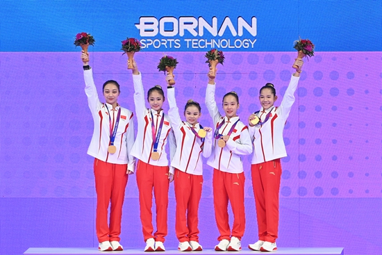 9月25日,杭州亚运会竞技体操女子资格赛暨团体决赛,中国体操队卫冕亚运会女子团体金牌。视觉中国供图