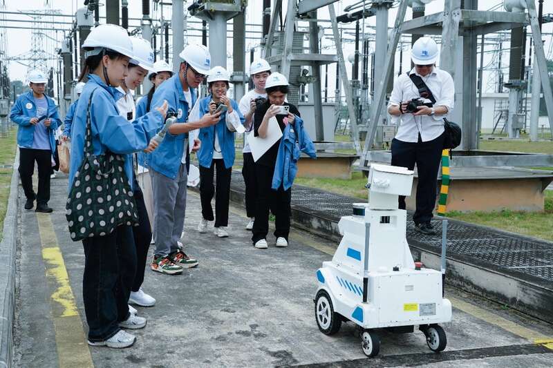 在南网超高压公司广西平果实训部的草地上,各式各样的无人机一列排开。随着无人机喷火消缺演示将大家的目光从地面引向高空,30米高的铁塔上出现两抹红色的身影,是戴着红色安全帽的工作人员,演示如何在带电情况下进行绝缘子更换。“滋啦滋啦”的电流声听着令人生畏,让大学记者们好奇地询问电网一线人员必须带电作业的原因。