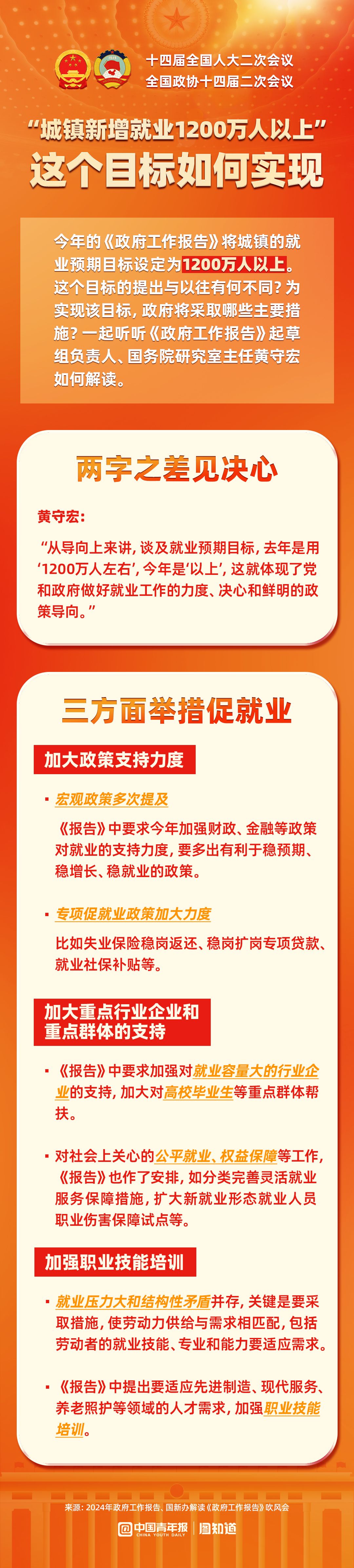 今年的《政府工作报告》将城镇的就业预期目标设定为1200万人以上。这个目标的提出与以往有何不同?为实现该目标,政府将采取哪些主要措施?一起听听《政府工作报告》起草组负责人、国务院研究室主任黄守宏如何解读。