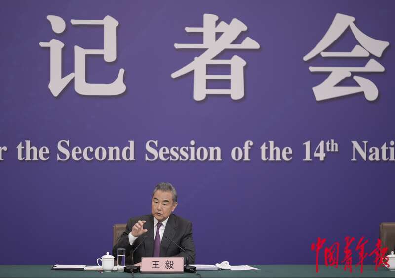 3月7日上午,北京梅地亚中心,十四届全国人大二次会议举行外交主题记者会,中共中央政治局委员、外交部部长王毅回应中美关系的提问。中青报·中青网记者 李隽辉/摄