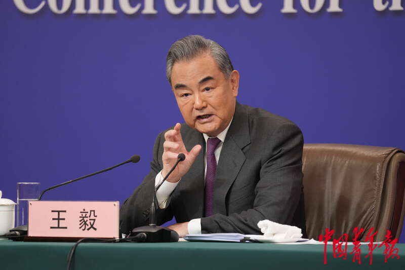 3月7日上午,北京梅地亚中心,十四届全国人大二次会议举行外交主题记者会,中共中央政治局委员、外交部部长王毅回答中欧关系相关问题。中青报·中青网 李隽辉/摄