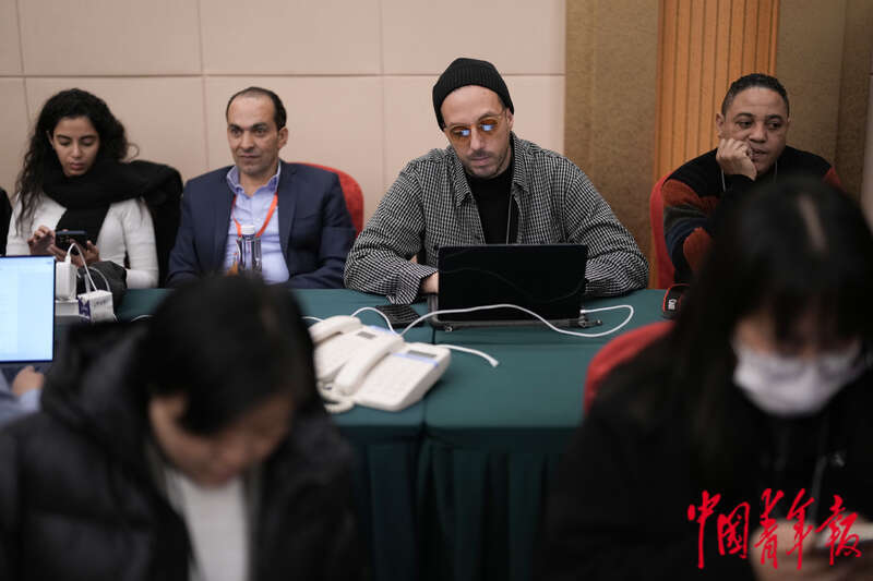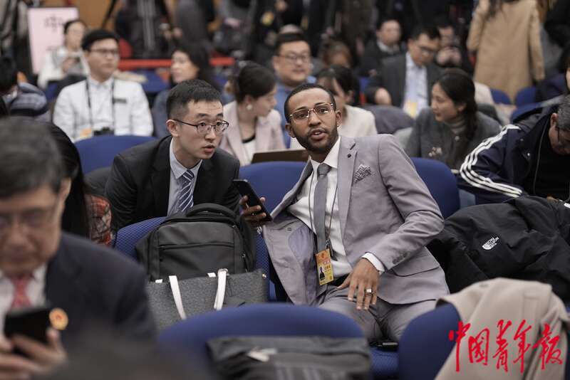 3月7日,北京梅地亚中心,十四届全国人大二次会议外交主题记者会开始前,坦桑尼亚桑给巴尔广播电视台记者(右一)在会场内与同行交流。中青报·中青网记者 李隽辉/摄