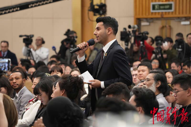 3月7日,北京梅地亚中心,十四届全国人大二次会议外交主题记者会上,中阿卫视记者就“如何讲好中国故事”向中共中央政治局委员、外交部部长王毅提问。王毅说,曾在视频中看过这位记者跳“科目三”,并表示,这些年越来越多“洋网红”因分享在中国的所见所闻而受到各国网友的喜爱,欢迎更多外国朋友一起来讲述活力满满、热气腾腾的中国故事,讲述中国同各国携手构建人类命运共同体的故事。中青报·中青网记者 李隽辉/摄