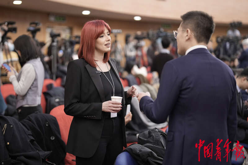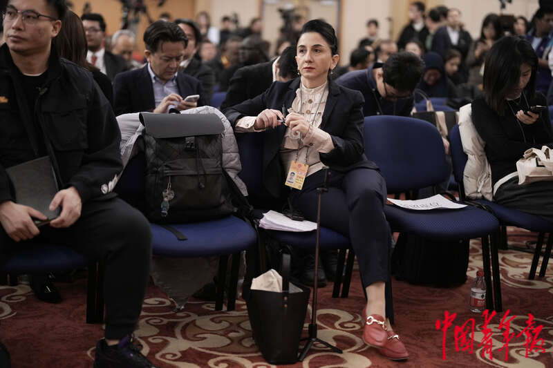 3月7日,北京梅地亚中心,十四届全国人大二次会议外交主题记者会开始前,格鲁吉亚“穆塔瓦里”媒体中心记者凯瑟琳·古卢阿在现场。中青报·中青网记者 李隽辉/摄