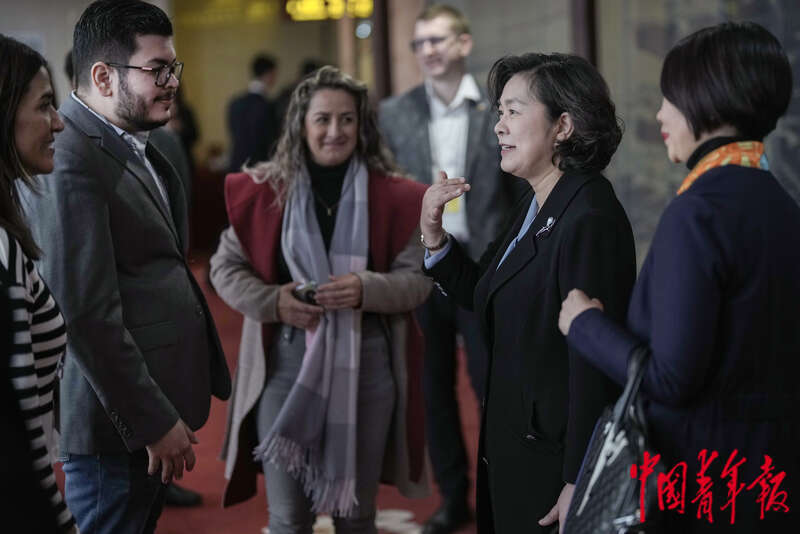 3月7日,北京梅地亚中心,十四届全国人大二次会议外交主题记者会结束后,在记者会上担任主持人的中国外交部部长助理、新闻发言人华春莹(右二)与外媒记者交流。中青报·中青网记者 李隽辉/摄