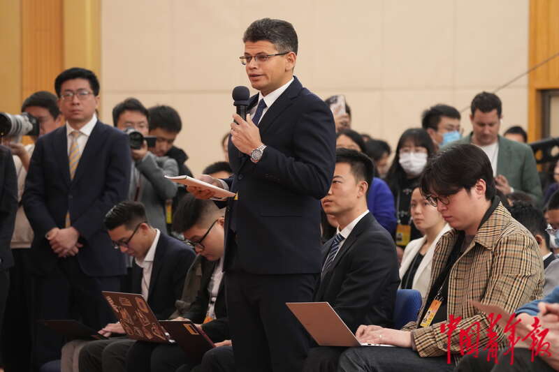 3月7日,北京梅地亚中心,十四届全国人大二次会议外交主题记者会上,埃及尼罗河电视台记者就巴以问题向中共中央政治局委员、外交部部长王毅提问。中青报·中青网记者 李隽辉/摄