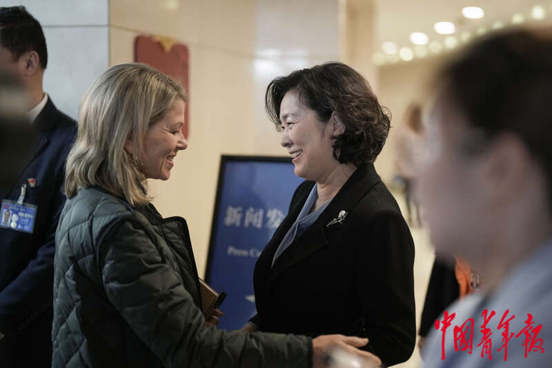3月7日,北京梅地亚中心,十四届全国人大二次会议外交主题记者会结束后,在记者会上担任主持人的中国外交部部长助理、新闻发言人华春莹与一名外媒记者交流。中青报·中青网记者 李隽辉/摄