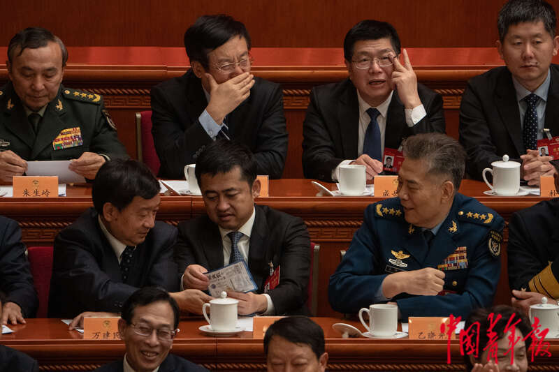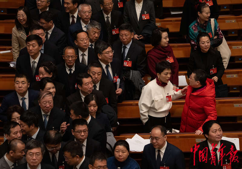 3月10日上午,北京,人民大会堂,全国政协十四届二次会议闭幕会结束后,参会委员退场时互相交流。中青报·中青网记者 李峥苨/摄