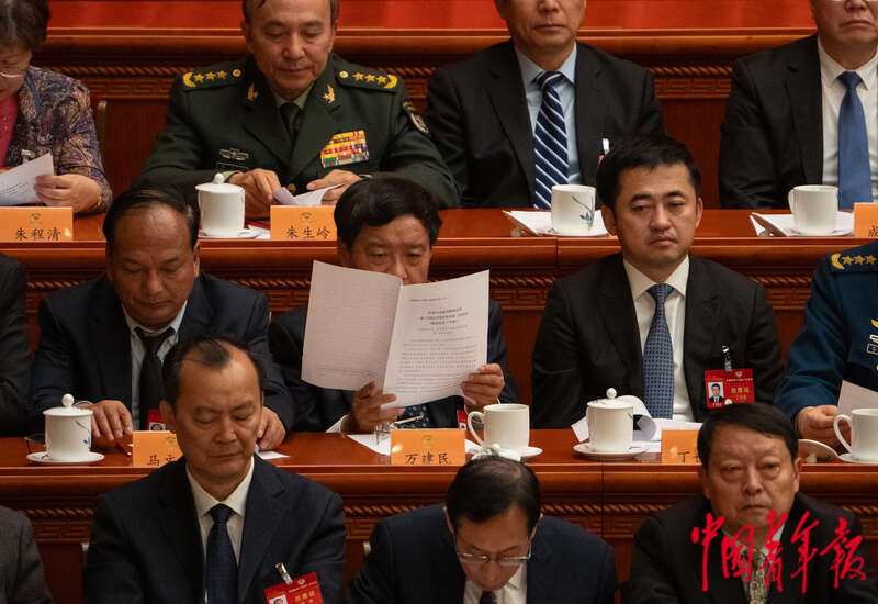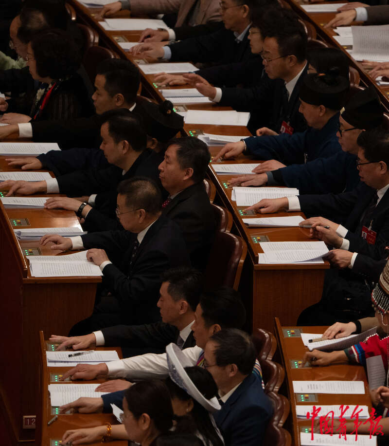 3月10日上午,北京,人民大会堂,全国政协十四届二次会议举行闭幕会,参会委员阅读政协第十四届全国委员会第二次会议政治决议。中青报·中青网记者 李峥苨/摄