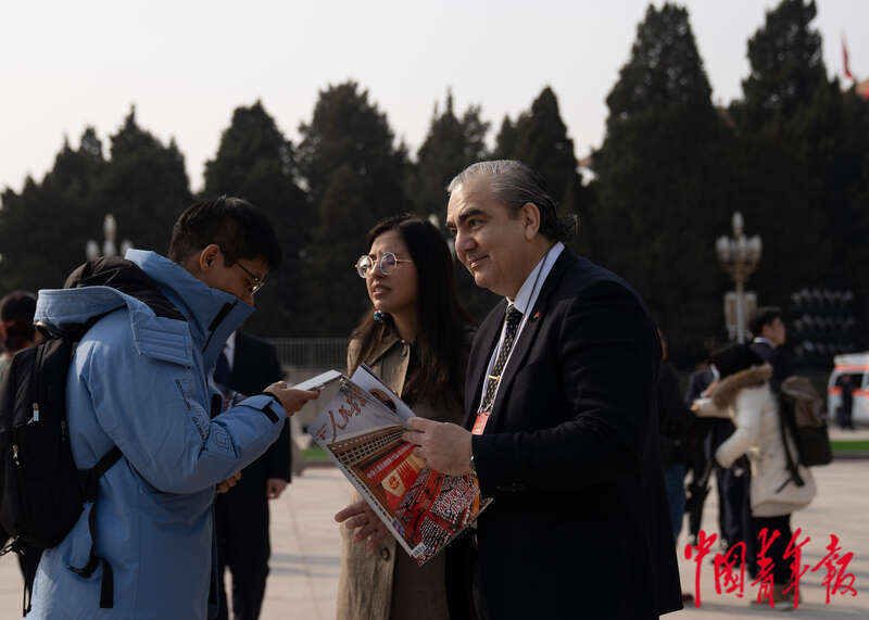 3月10日上午,北京,人民大会堂,全国政协十四届二次会议闭幕会结束后,一位列席会议的外国使节阅读大会相关报道。中青报·中青网记者 李峥苨/摄