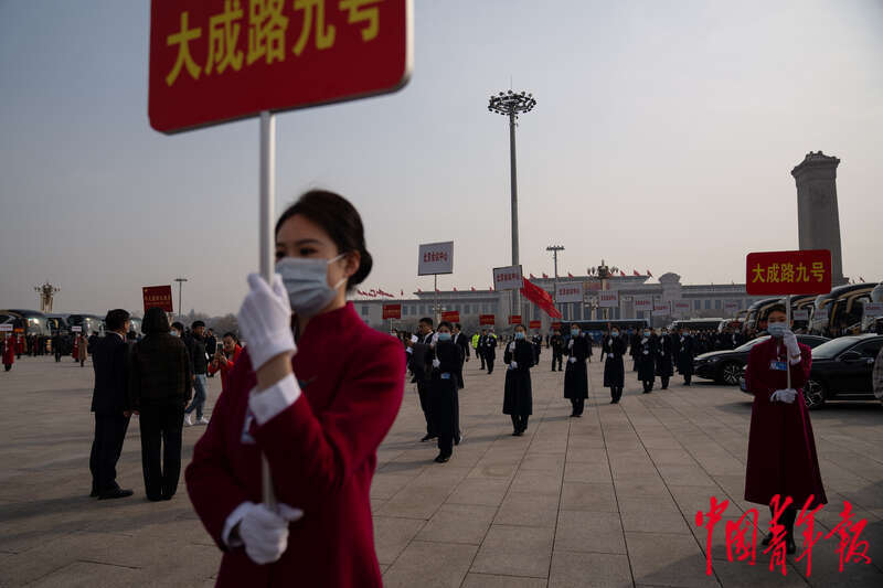 3月10日上午,北京,天安门广场,全国政协十四届二次会议闭幕会结束后,工作人员等待接参会委员回到驻地。中青报·中青网记者 李峥苨/摄
