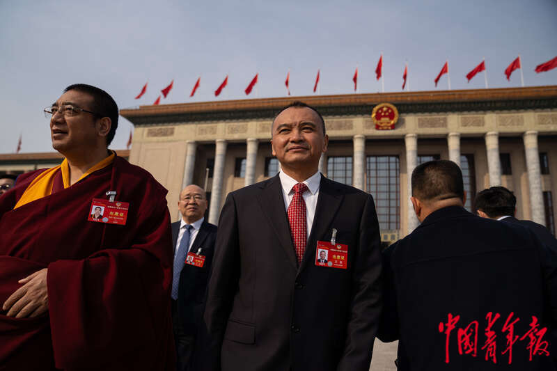 3月10日上午,北京,人民大会堂,全国政协十四届二次会议闭幕会结束后,青海大学农林科学院副院长王舰(前右)、中国佛教协会副会长赛赤·确吉洛智嘉措等委员退场。中青报·中青网记者 李峥苨/摄