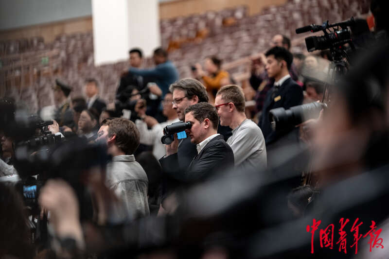 3月11日下午,北京,十四届全国人大二次会议在人民大会堂举行闭幕会,一名外国记者用望远镜观看。中青报·中青网记者 李隽辉/摄