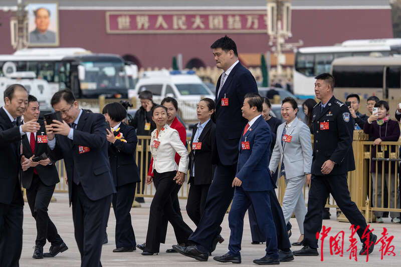 3月11日下午,北京,十四届全国人大二次会议在人民大会堂举行闭幕会,会议开始前,全国人大代表、中国篮协主席姚明和其他代表一起走向会场。中青报·中青网记者 李隽辉/摄