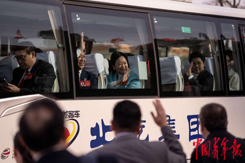 3月11日下午,北京,十四届全国人大二次会议在人民大会堂举行闭幕会,会议结束后,香港代表团的代表乘车离开时向广场上的记者挥手道别。中青报·中青网记者 李隽辉/摄