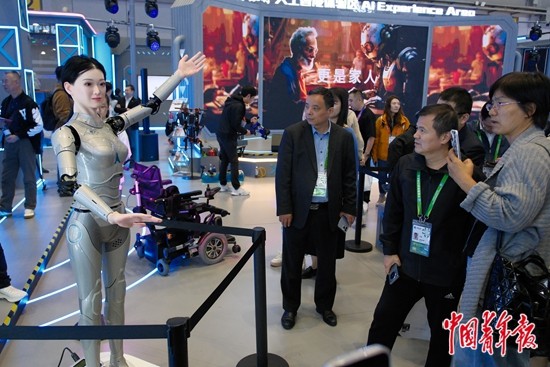 11月6日,国家会展中心(上海),第七届中国国际进口博览会技术装备展区,一台人形机器人正跟随音乐翩翩起舞,吸引不少参观者驻足观看。中青报·中青网记者 田嘉硕/摄