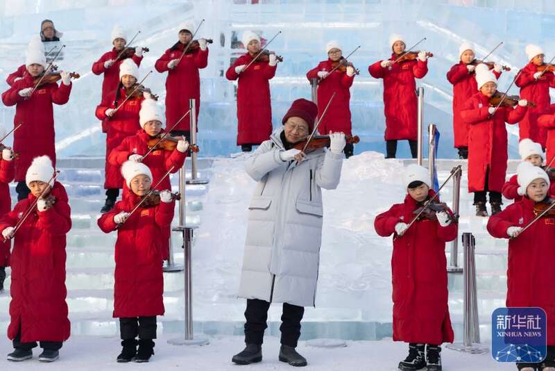 1月12日,小提琴演奏家薛苏里与哈尔滨勋菲尔德少儿艺术团的小提琴演奏者在音乐“快闪”上演奏(无人机照片)。