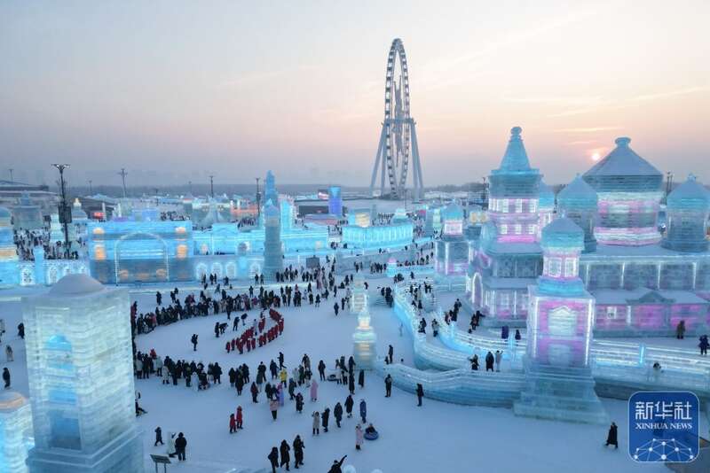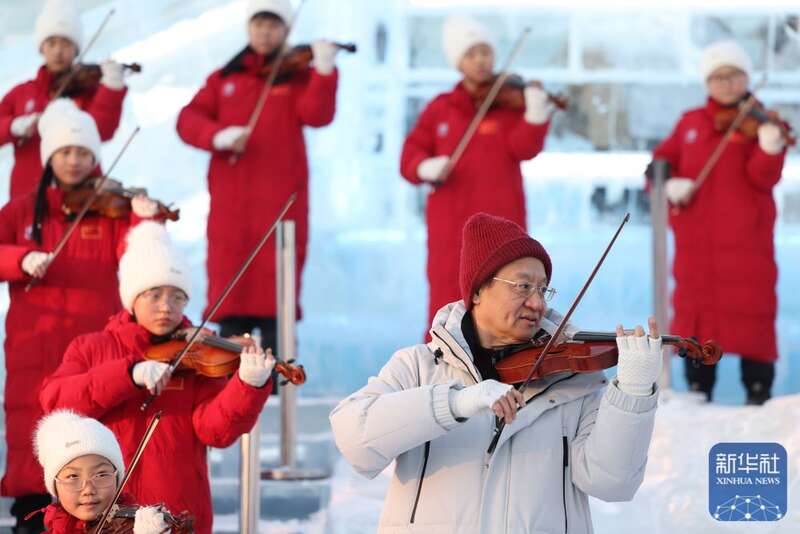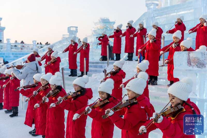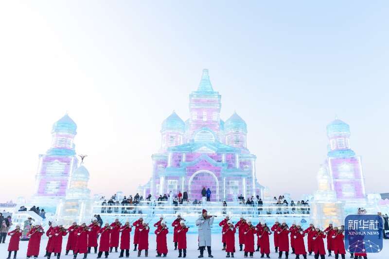 当日,哈尔滨冰雪大世界园区上演音乐“快闪”,为即将到来的亚冬会助力。
