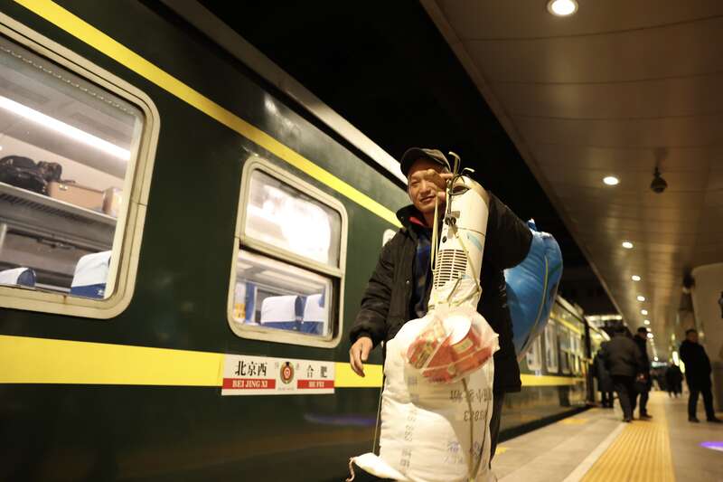 1月13日晚,K4159次列车静静停靠在北京西站,站台上,挑着行李的大叔刘竹林正在找自己的车厢座位。他挑担的前面放着他最值钱的家当一台暖风机,底下垫着为数不多的衣物,挑担的后面是被褥。刘竹林是家里的顶梁柱,在北京务工近30年,如今妻子在家里带小孙子,他说再干两年也不干了。老刘希望年过30岁的大儿子能早日结婚,了却他一桩心愿。