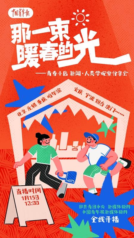 本报北京1月14日电(中青报·中青网见习记者 逯清钰 记者 温维娜)在新春佳节即将到来之际,中国青年报社于1月15日13时至21时举办“青春小店 新闻·人类学观察分享会”,盛邀广大网友一起探访充满青春活力的特色小店,共赏“那一束暖春的光”。