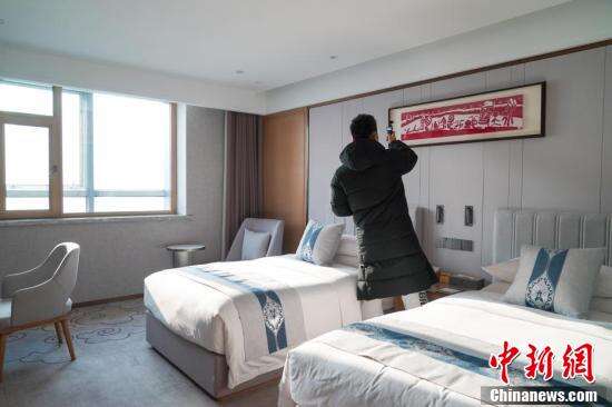 哈尔滨亚冬会冰上项目运动员村,运动员房间装饰吸引媒体拍照。