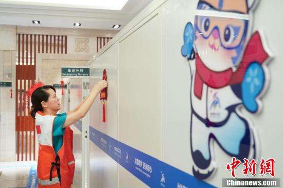 哈尔滨亚冬会冰上项目运动员村,在位于4楼的医疗诊所,哈医大一院护理部副主任杨红艳在挂春节装饰,她表示1月20日就已正式入驻,将在医疗方面为运动员们提供保障直至亚冬会结束。