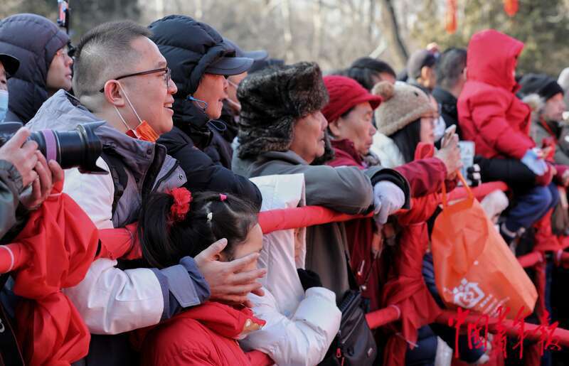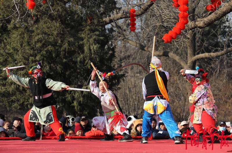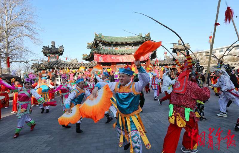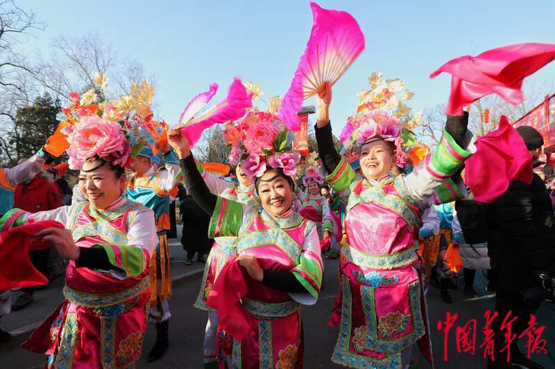 1月29日(正月初一),北京,第三十九届龙潭春节文化庙开幕式上的花会表演。当日,第三十九届龙潭春节文化庙会正式启幕。本届龙潭庙会以“都城万象焕新颜 京华春意乐大年”为主题,通过古都腔调、市井喧腾、都会烟火、京华风物、京彩冰雪、千树结彩六大板块内容,展现首都古韵与现代北京、春节民俗传统文化与潮流文化的有机结合。美食文创、曲艺花会、冰雪体育、棋类娱乐等体验内容精彩纷呈,为游客编织了一幅充满京味儿风情的新春画卷。中青报·中青网记者 李建泉/摄