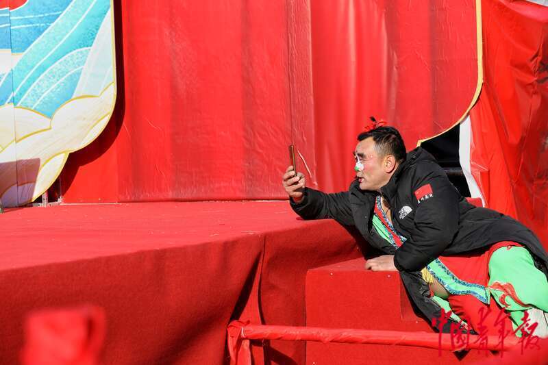 1月29日(正月初一),北京,第三十九届龙潭春节文化庙会上,等待上场表演的演员用手机拍摄其他团队的演出。中青报·中青网记者 李建泉/摄