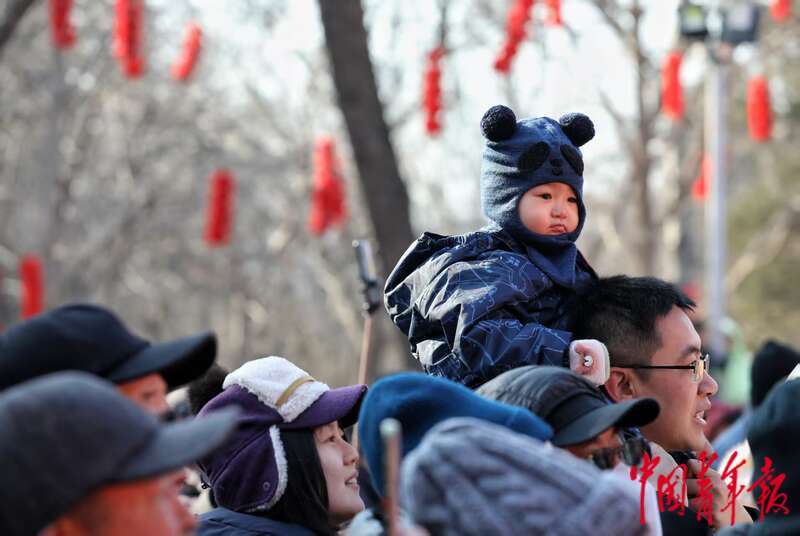 1月29日(正月初一),北京,第三十九届龙潭春节文化庙会,一位家长一边看演出一边用手帮孩子捂住耳朵保暖。中青报·中青网记者 李建泉/摄