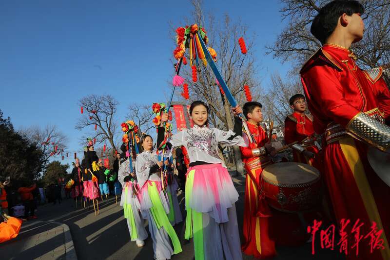 1月29日(正月初一),北京,第三十九届龙潭春节文化庙会,来自全国各地的特色花会表演队伍载歌载舞在园区内巡游。中青报·中青网记者 李建泉/摄