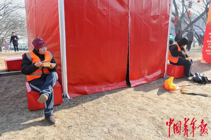 1月29日(正月初一),北京,第三十九届龙潭春节文化庙会上,忙碌的工作人员在抽空吃午餐。中青报·中青网记者 李建泉/摄
