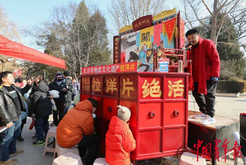 1月29日(正月初一),北京,第三十九届龙潭春节文化庙会上,传统的“拉洋片”表演让孩子们喜欢。中青报·中青网记者 李建泉/摄