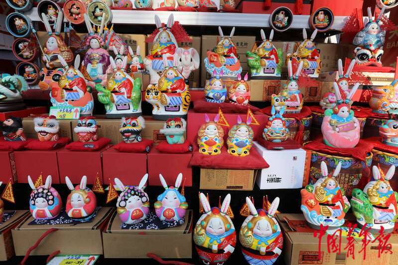1月29日(正月初一),北京,第三十九届龙潭春节文化庙会上,以“兔儿爷”等传统民俗形象为灵感的文创产品五花八门。中青报·中青网记者 李建泉/摄