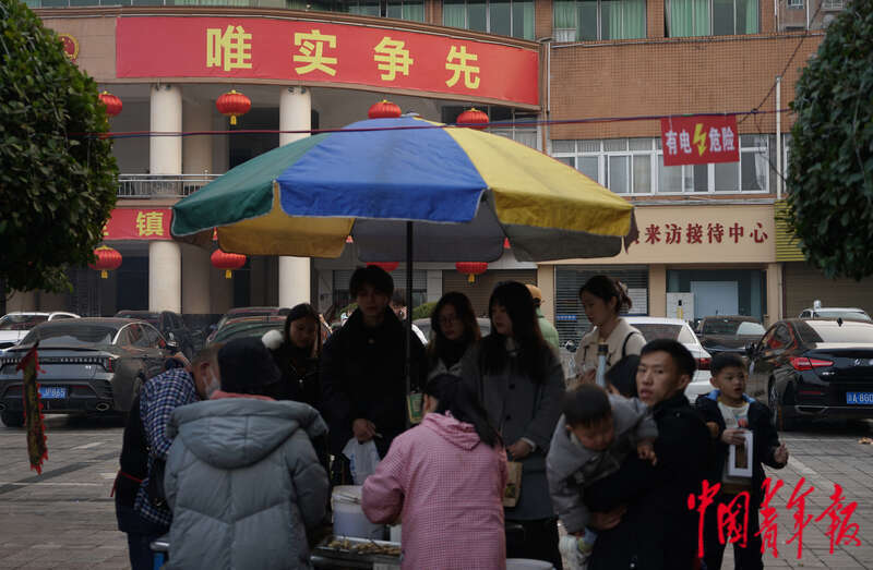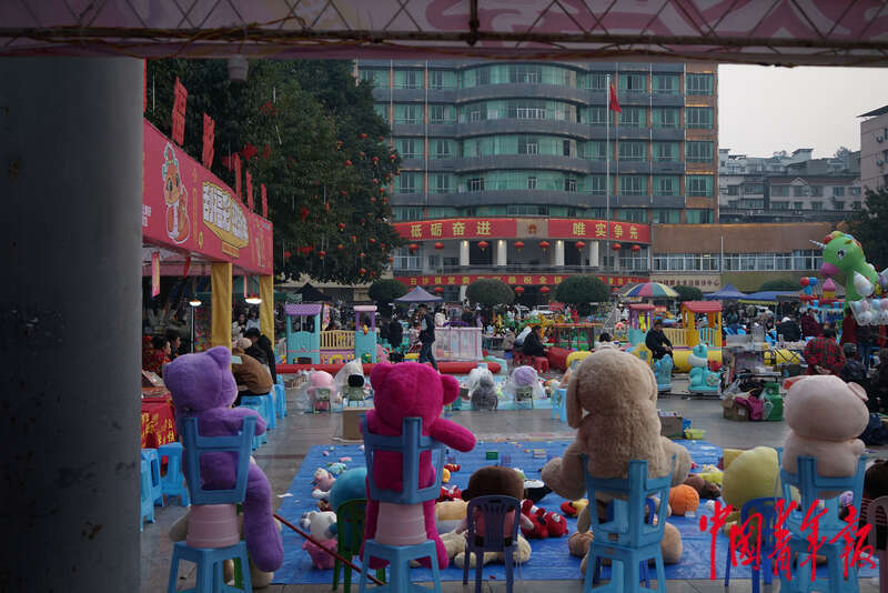 1月29日,重庆江津,白沙镇政府门前的广场上四处摆着餐饮、娱乐摊位。中青报·中青网记者 李强/摄