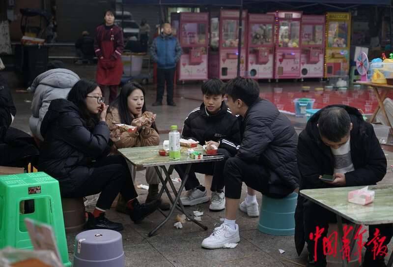 1月29日,重庆江津,4名年轻人在镇政府门前的广场上吃烤苕皮。中青报·中青网记者 李强/摄