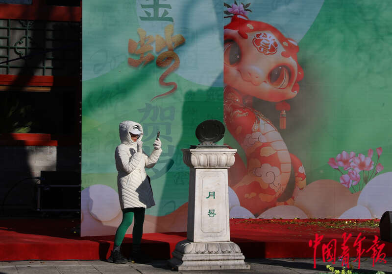 2月3日,北京古观象台,一位市民在立春文化节活动舞台旁拍照。中青报·中青网记者 陈剑/摄