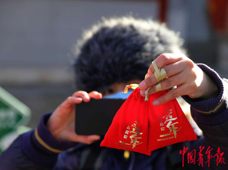 2月3日,北京古观象台,一位市民收到新春福袋后,用手机拍照留念。中青报·中青网记者 陈剑/摄