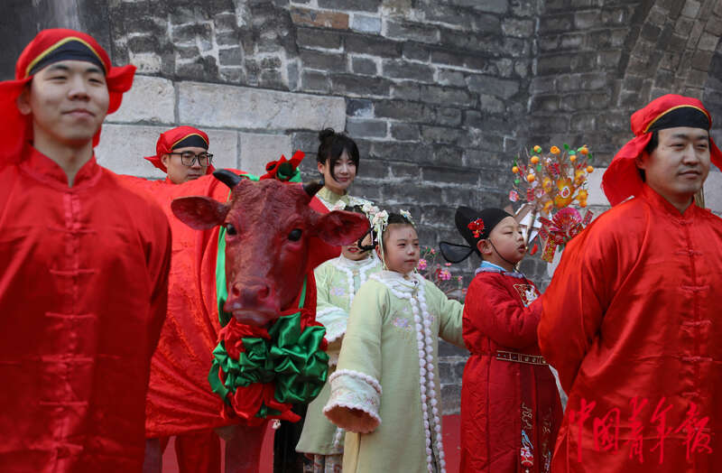2月3日,北京古观象台,嘉宾正在进行“鞭打春牛”的传统仪式,传递对美好生活的期盼与向往。当天是农历正月初六,正值乙巳蛇年的立春之日,北京市东城区建国门街道第十八届乙巳蛇年立春文化节活动在这里举行,为市民们带来一场融合传统文化与现代活力的新春盛宴。据介绍,立春作为二十四节气中的首个节气,象征着春天的开始和万物复苏。“鞭打春牛”的民俗在我国已有3000多年的历史,是对农事的提醒,它意味着农民应该开始准备春耕工作。“一年之计在于春”,在我国传统文化中,立春是民众对整个春天以及这一年充满美好愿望的一天。中青报·中青网记者 陈剑/摄