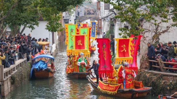 江苏昆山:周庄古镇彩旗招展 水上巡游迎财神