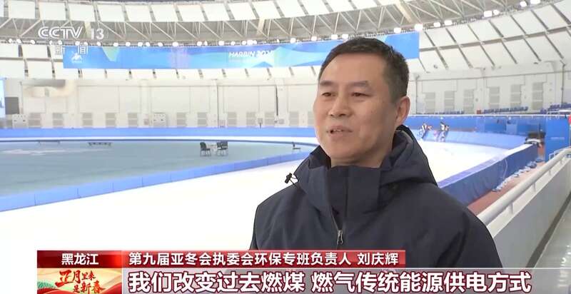 第九届亚冬会执委会环保专班负责人 刘庆辉:我们改变过去燃煤、燃气传统能源供电方式,立足我们黑龙江省本身丰富的风力等自然资源,全面开发使用绿色清洁能源,本地的这些发电企业产生风能、太阳能等清洁能源将源源不断地输入我们的各个场馆,全面满足我们赛时各个场馆的用电需求,在亚冬会史上是首次实现绿电100%全覆盖。
