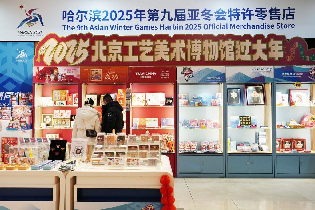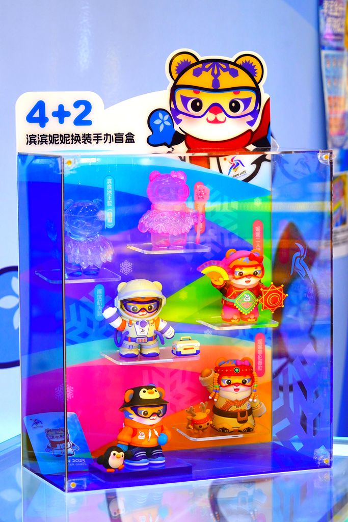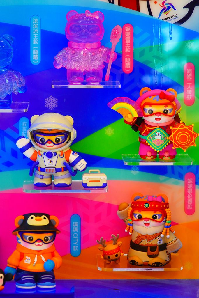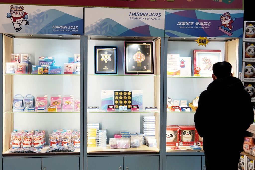 2025年2月6日,北京,亚冬会特许商品零售店柜台上陈列着琳琅满目的亚冬会周边文创产品,从可爱的吉祥物“滨滨”和“妮妮”的毛绒公仔、盲盒手办,到设计精美的徽章、冰箱贴、纪念章,还有实用的钥匙链、文具、背包等,丰富多样的商品让人目不暇接。