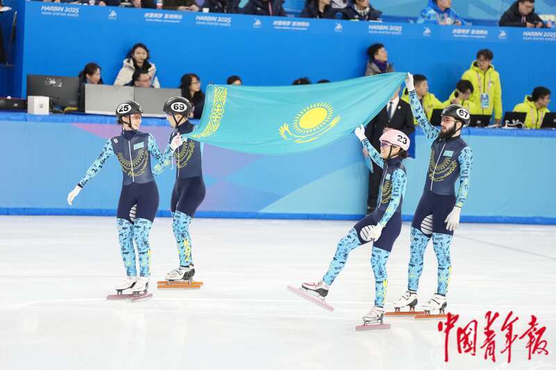 2月8日,黑龙江哈尔滨,第九届亚冬会短道速滑混合团体2000米接力决赛结束后,获得亚军的哈萨克斯坦队手持国旗庆祝。中青报·中青网记者 李隽辉/摄