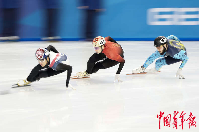2月8日,黑龙江哈尔滨,第九届亚冬会短道速滑混合团体2000米接力决赛,中国队选手刘少昂(中)在比赛中。中青报·中青网记者 李隽辉/摄