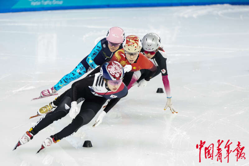 2月8日,黑龙江哈尔滨,第九届亚冬会短道速滑混合团体2000米接力决赛,各国选手在赛道上竞逐。中青报·中青网记者 李隽辉/摄