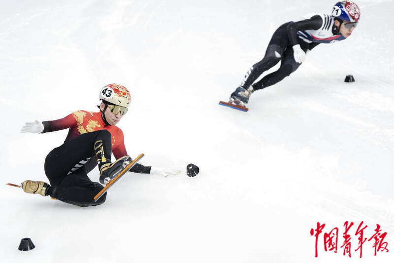 2月8日,黑龙江哈尔滨,第九届亚冬会短道速滑混合团体2000米接力决赛,中国队选手林孝埈(左)在比赛中摔倒。中青报·中青网记者 李隽辉/摄