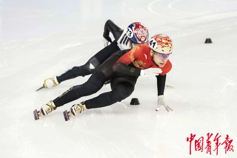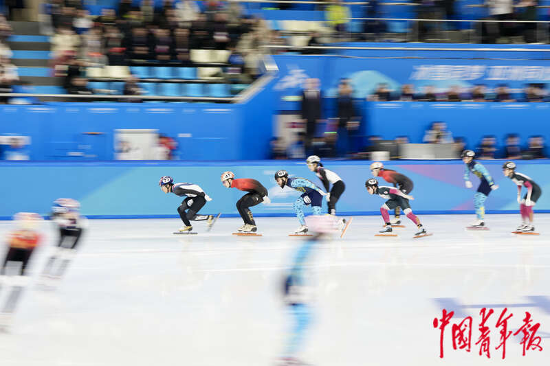 2月8日,黑龙江哈尔滨,第九届亚冬会短道速滑混合团体2000米接力决赛,中国队选手刘少昂(前)在比赛中。中青报·中青网记者 李隽辉/摄