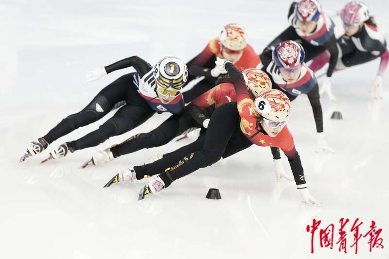 2月8日,黑龙江哈尔滨,第九届亚冬会短道速滑女子1500米决赛,中国队选手公俐(左二)和臧一泽(左三)在比赛中。中青报·中青网记者 李隽辉/摄